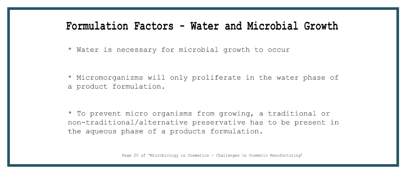 Below you will find the results of an extensive study on water in cosmetics from the Senior Manager of Research and Development Microbiology with Avon Products, Inc.